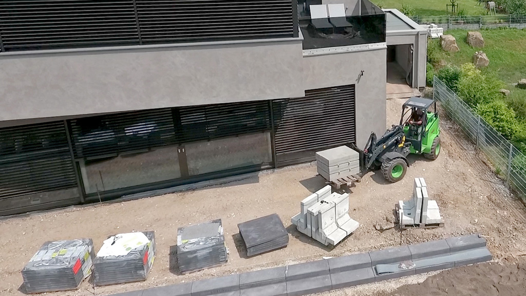 But that’s not all: the 2445 SLT can also be used for operations outside of private gardens. “We are receiving more and more jobs involving paving work in underground car parks and their roofs. There are two key details when it comes to using machinery on such jobs: the height of the machinery and the working weight. Of course, the height of the garage places a limitation on the height of the machinery. But also in terms of the weight of a loader, limits were quickly reached as for multi-storey garages, it all comes down to the load carrying capacity of the driving surface and certain roof loads cannot be exceeded” explained Site Managers Michael Stemich and Darius Olech. Even when faced with such a challenge, the 2445 SLT still offers the ideal choice due to its lightweight working weight and low design.